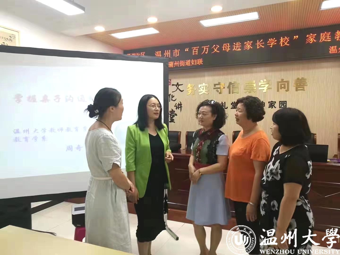 瓯海区家庭教育直播课《学会做人,家庭教育的根和魂》收看超11万人次;浙江省委宣传部省妇联主办家庭家教家风基层巡讲活动走进安吉直播课《了解孩子,做智慧型父母》,现场直播3.69万人次;浙江省家庭教育云课堂直播《掌握亲子沟通的密码》中小学生家长观看超19万人次;还有温州市家庭教育云课堂第一课《“双减”政策之下,我们如何做父母》;为温州大学师生、乐清市、瓯海区妇联干部等主讲《传承优良家风,培育家国情怀》等等。工作之余的一场场讲座见证了周奇老师的家庭教育公益路程,她充实着、幸福着。