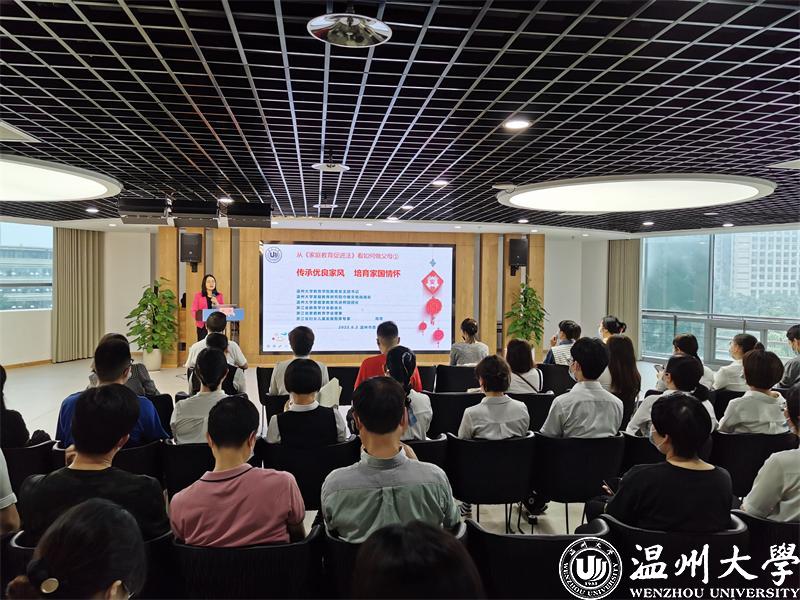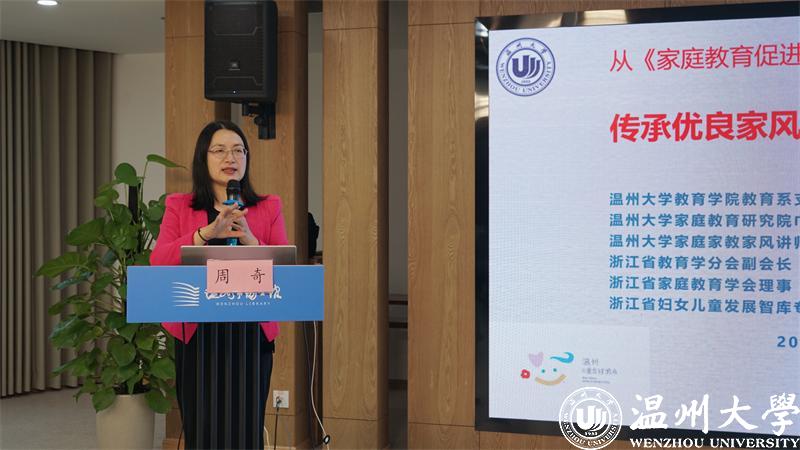 90足球直播网 教育学系党支部书记、温州大学家庭教育研究院巾帼文明岗岗长、全国家庭工作先进个人、浙江省妇女儿童发展智库专家、浙江省家庭教育讲师团成员、家庭教育工作坊负责人周奇老师进行《传承优良家风 培育家国情怀》的主题讲座。