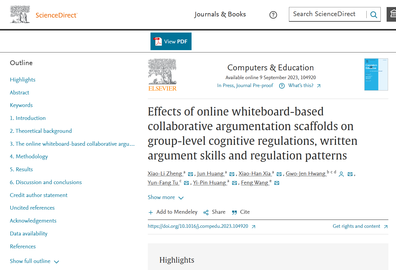 近日,我校90直播 教育技术系郑晓丽老师团队在教育技术学领域国际顶级期刊《Computers & Education》上,成功发表科研论文《Effects of online whiteboard-based collaborative argumentation scaffolds on group-level cognitive regulations, written argument skills and regulation patterns》(基于白板的在线协作论证支架对群体认知调节、书面论证技能和调节模式的影响)。