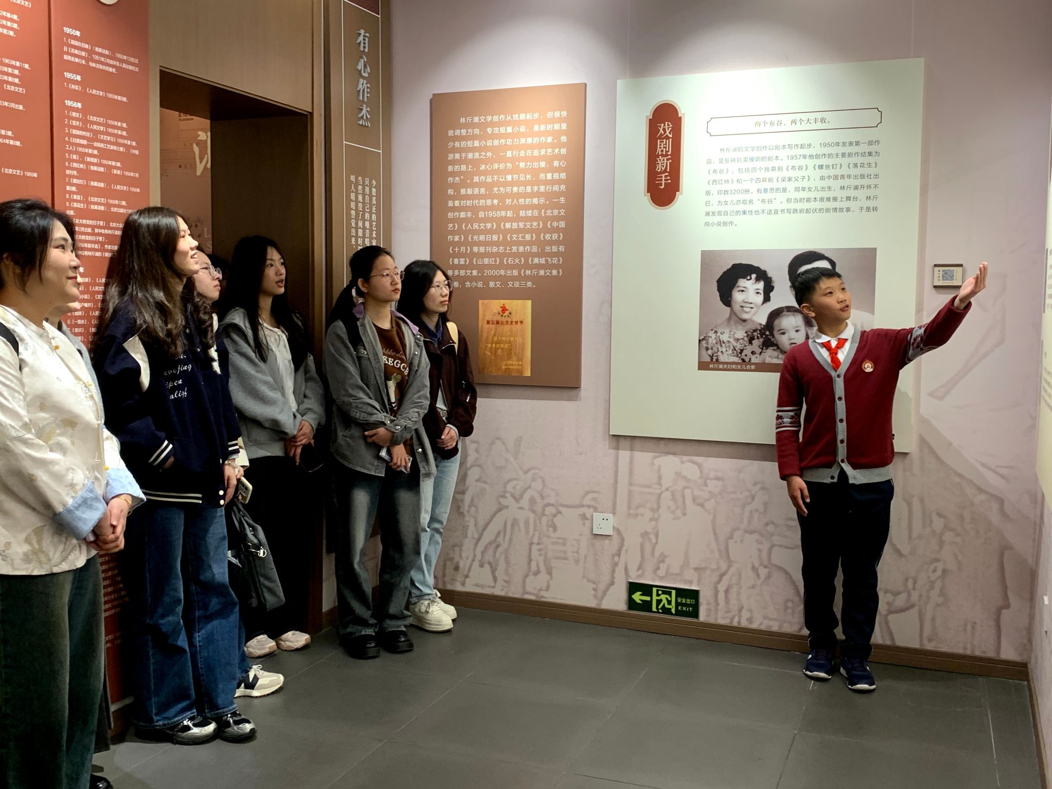 跟随着小小讲解员的指引,我们了解到林斤澜先生的成长轨迹与广场路小学紧密相连。其父亲林丙坤于1914年创办了一所小学,即如今的广场路小学沧河校区。2004年,林斤澜先生在沧河小学90周年校庆时重返母校,感慨道“温州童年回忆在可爱的沧河巷,梦境般美好”。正因这份深厚情谊,林斤澜文学馆选址于此。生动的语言讲解结合形象的馆藏呈现,令在场的实习老师们无一不深刻感受到文学的力量与文化传承的重要性。