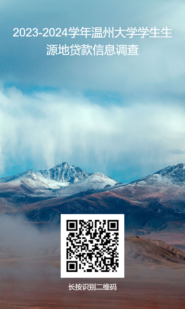 根据国家开发银行生源地信用助学贷款手续办理的要求,学生在生源地办理完毕信用助学贷款后,需要高校在限定时间内进行网上回执录入,请各办理国开行生源地贷款的新老生,务必在9月20日前在网上完成《2023-2024学年温州大学学生生源地贷款信息调查》的填写,二维码如下: