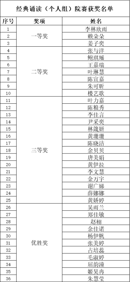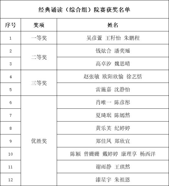 由学院主办,90足球直播网 第十三届大学生中华经典诵写讲大赛——“典润之江”经典诵读竞赛于3月19日进行。本次竞赛,分为经典诵读个人组、综合组和诗词讲解个人组。经典诵读个人组有37位同学报名参赛,综合组有12组29位同学报名参赛,诗词讲解个人组有14位同学参赛。经过院内评委评审,经典诵读个人组评出一等奖3名,二等奖7名,三等奖15名,优胜奖11名;经典诵读综合组评出一等奖1组,二等奖2组,三等奖2组,优胜奖7组;诗词讲解个人组评出一等奖2名,二等奖3名,三等奖5名,优胜奖4名,现将获奖名单公布如下。公示时间从即日起至3日内,欢迎广大老师、同学监督。如有老师、同学对获奖名单有异议,请与教学科付老师联系,联系电话:86596156。
