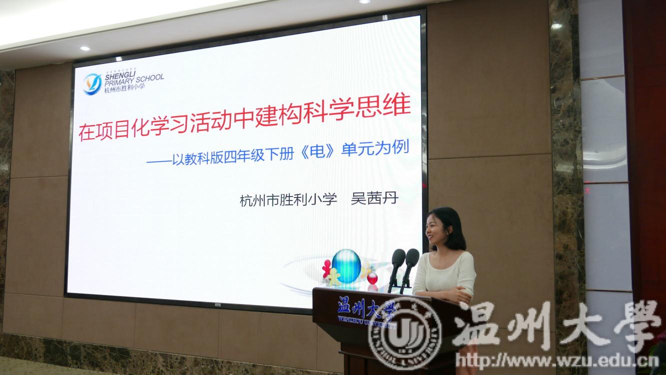 随后是10级吴茜丹学姐演讲的项目化学习活动过程中科学思维的构建——以小学科学教科版四年级下册《电》单元为例。吴茜丹学姐成绩斐然,现在是2018年杭州市上城区优秀教师,区级以上教学案例论文获奖15篇,获得区级以上公开课优质课共9节。