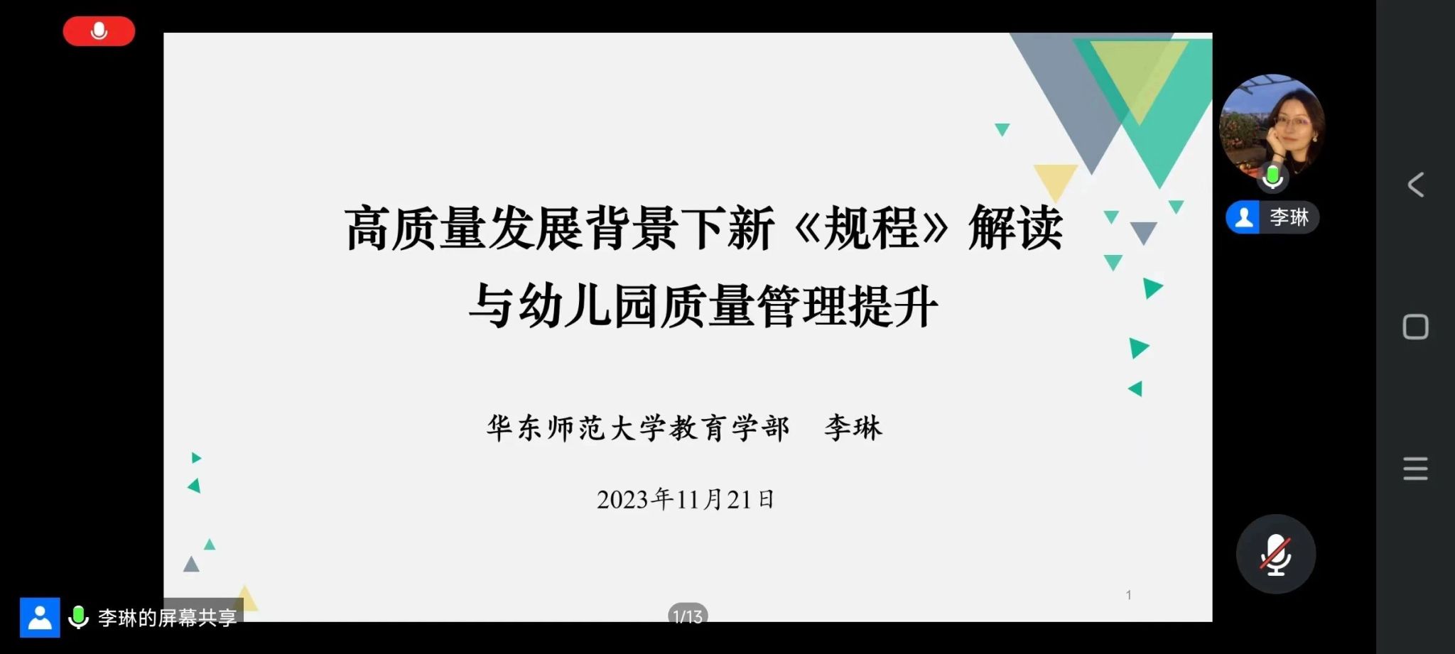 华东师范大学教育学部李琳教授用简洁明了的语言,深入浅出地解读了新版《幼儿园工作规程》,让我们更加全面地了解了其内容和意义。李琳教授介绍了新版《幼儿园工作规程》的修订背景和主要修订内容,让我们看到了国家对于学前教育事业的高度重视和关注。接着,她详细读了《幼儿园工作规程》的各个部分重点讲解了保育和教育工作的要求和标准,以及如何提升幼儿园保教质量的具体措施和方法。