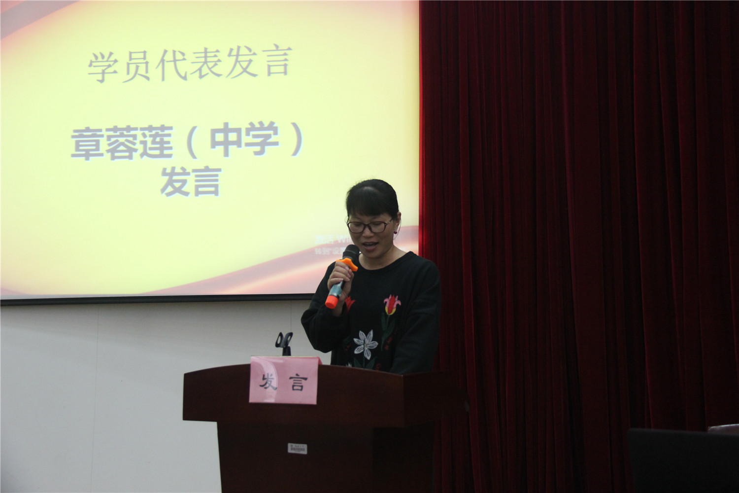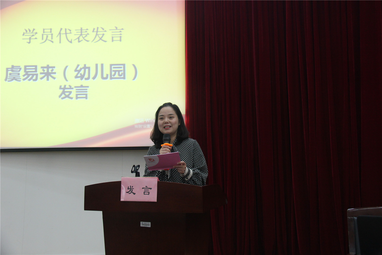 龙湾区永强中学章蓉莲副校长、温州大学附属实验幼儿园虞易来老师分别代表中学校长班、园长班的学员发言。