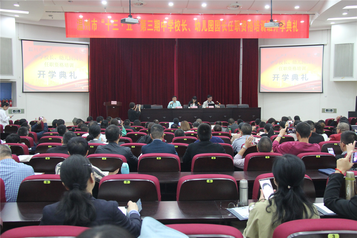 2018年10月16日上午,温州市“十三·五”第三期中学校长、幼儿园园长资格任职培训开学典礼在我校学院路校区隆重举行。温州市教师教育院院长潘建中教授、温州大学教师90直播 院长孙芙蓉教授出席了本次典礼。典礼由温州大学教师90直播 副院长叶新东住持,来自温州市各县、市、区的130余位中学校长、幼儿园园长参加了此次典礼。