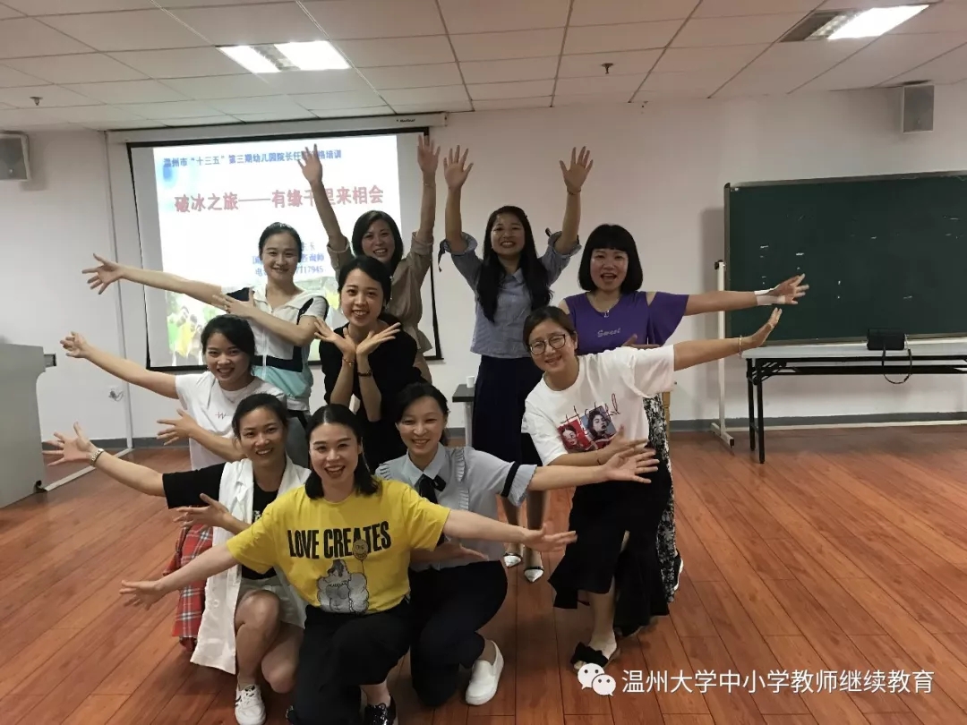后 话 园长培训作为温州大学服务地方基础教育工作的一个重要载体,如今已经走过近30个年头。近年来,为了能使培训更有效地解决学员的需求问题,我们坚持实践导向、专业引领、质量保障、创新开发的原则,在为学员提供符合学习需求的内容的基础上,在训前设计、实施导学环节,在训中布置团队学习任务、进行团队学习考核,在训后提供各种形式的专业引领服务等,有效激发学员的参训积极性,主动进行学习共同体建设。我们的目标是不论在训前、训中还是训后,温州大学都能为其提供专业引领的平台,并积极推动其专业成长团队的建设和维护。衷心期待各位学员一次相识、相知,终身同道、同行!