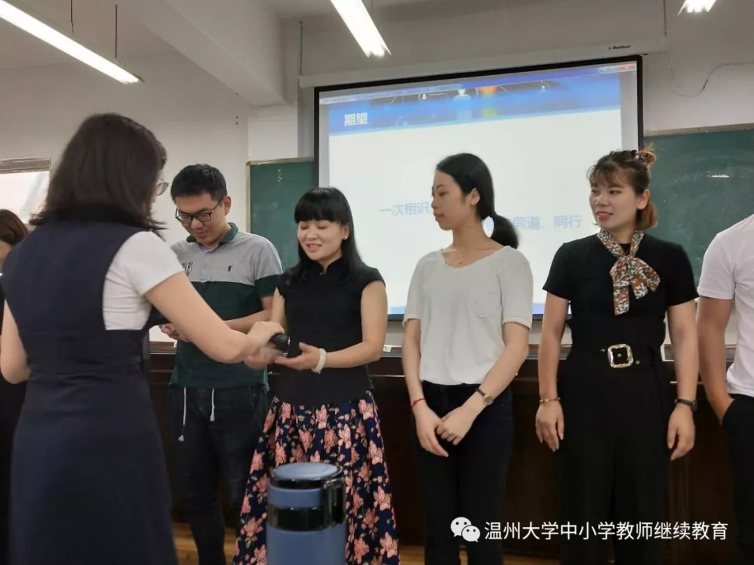 校友仪式 5月23日上午,此次园长培训项目负责人林鹣鹣老师为各位学员详细地介绍本次培训课程的内容设计、学习安排和考核要求。在课程的最后,林老师说,从我们走进温大的那刻起,就成为了温大的校友,作为校友,我们要有一个仪式,于是就有了校友仪式的一幕:培训团队的老师为我们发放并佩戴温大校徽,还为每个组长发放了一个带有校徽logo的钥匙扣,林老师说,每个学员现在或将来都是通向专业领域的一把钥匙,组长要像这个钥匙扣,紧紧得联系每个组员,今天的“培训学习共同体”会为我们的专业成长不断发挥作用。这满满的仪式感让我们对接下来的一切充满了实实在在的憧憬。—— [瑞安上望康康幼儿园黄倩瑜]