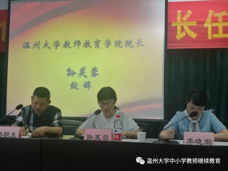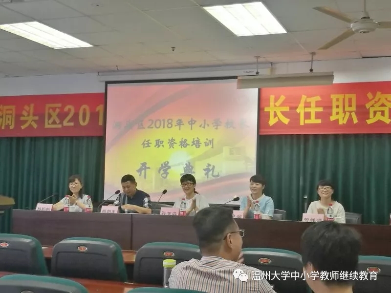 5月27日上午,洞头区2018年中小学校长任职资格培训班开学典礼在温州大学学院路校区继续教育大楼五楼报告厅举行。洞头区教育局党委委员、副局长季晓瀚、洞头区教育局党委委员、教师发展中心主任杨朝生、洞头区教育局政工科科长曾婵婵、温州大学教师教育院院长孙芙蓉、继续教育科科长林鹣鹣出席典礼。