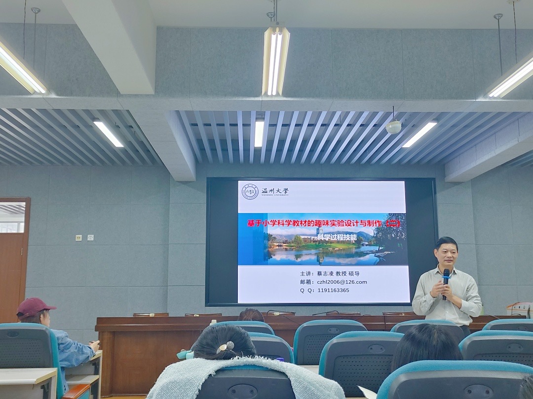 第一天的培训,蔡老师利用两节专题报告分别梳理了教材相应单元的专业基础知识,为老师们理清了相应的实验内容,充分让大家掌握了科学实验过程技能,从而挖掘出新教材中不同模块内容中的趣味实验素材,为大家能独立开展趣味实验的设计与制作奠定了扎实的理论基础。