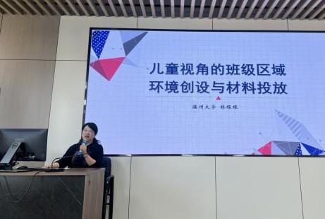 林琛琛副教授从儿童的视角出发,图文并茂地为大家讲解了班级区域环境创设要素、游戏材料选择与投放策略,深入分析了如何根据常规区和特色区的特点进行环境创设与材料投放,并提出了游戏材料设计与应用的新思路。重点介绍了益智类游戏材料的创新设计,讲解了如何基于一本绘本设计幼儿园游戏棋,并带着学员们以小组合作的形式体验合作性游戏棋的独特魅力。