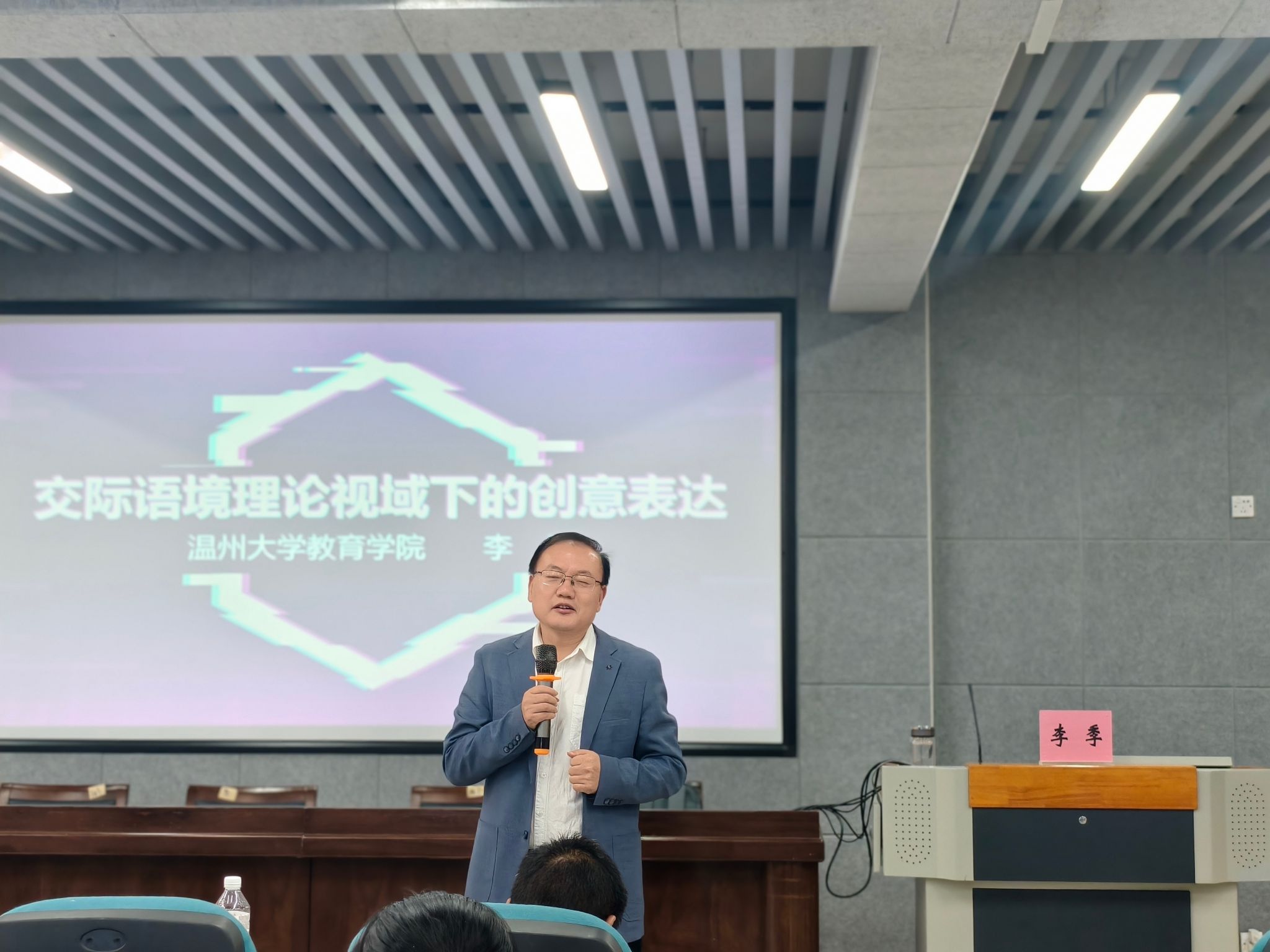 下午,90足球直播网 李季博士以《交际语境理论视域下的创意表达》为题开讲,从写作作为作品、写作作为过程、写作作为交流三大核心视角切入,结合交际语境要素,深度阐释创意表达教学的实践路径。