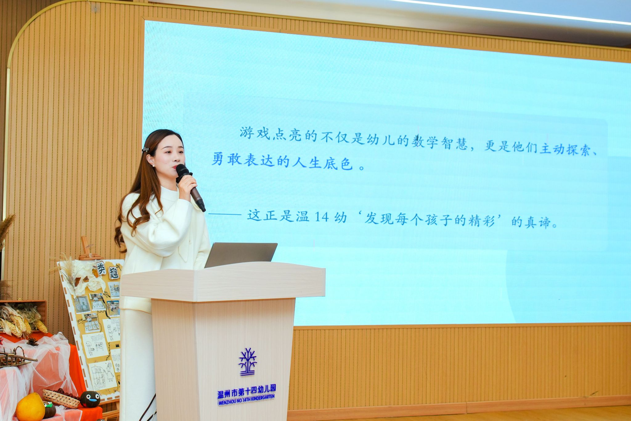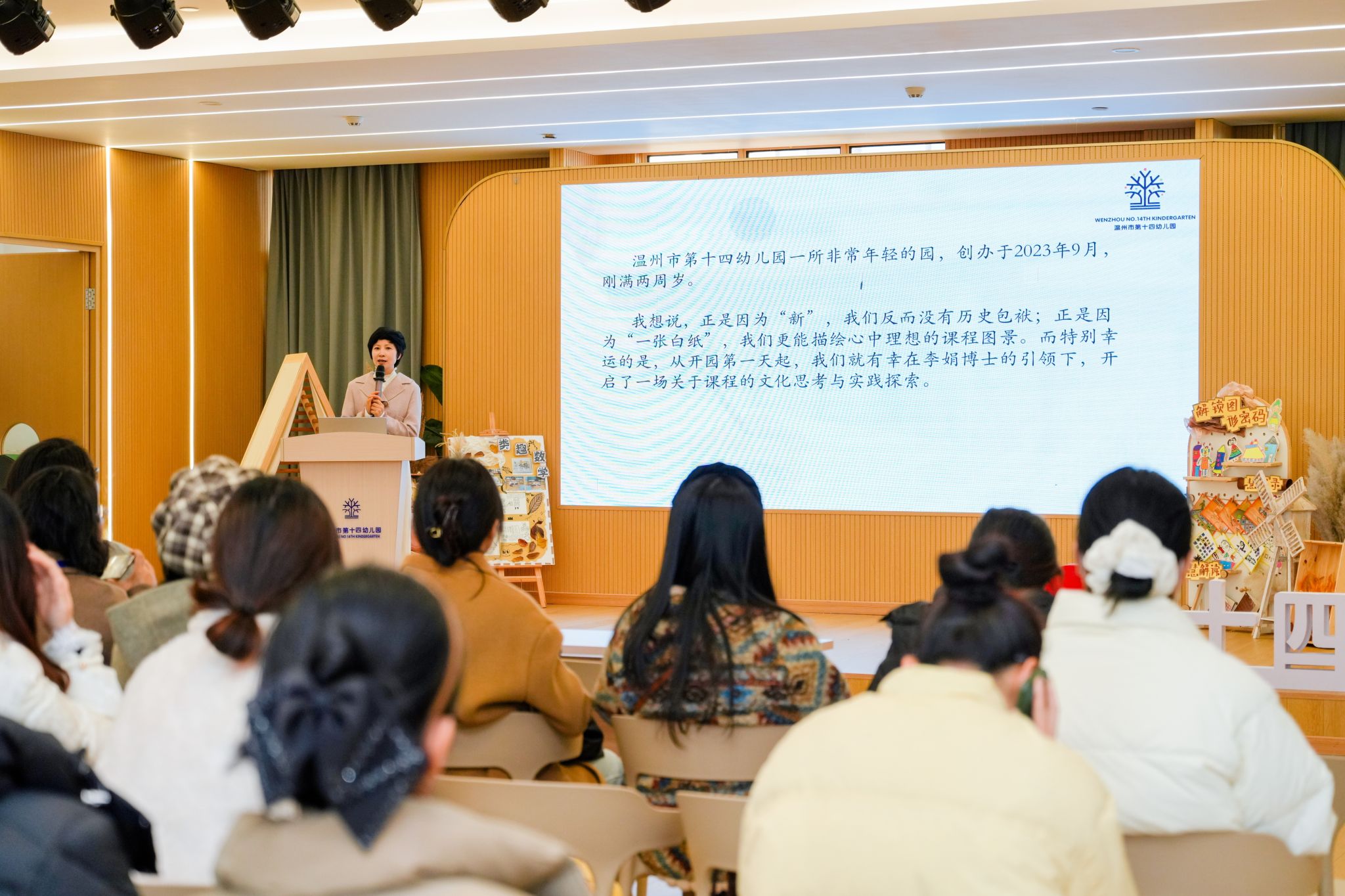 12月15日上午,全体学员老师们前往温州市第十四幼儿园德林居园区观摩学习。温州实艺教育集团林素云园长从《玩创数学——幼儿园高质量数学探索之路》专题中介绍并分享温十四幼探索“数玩”课程的三阶进阶之路。实践开篇明确高质量数学活动的核心定位,以“数玩”为径,以“发现每个孩子的精彩”为核心,让数学回归幼儿生活与游戏,成为激发思维、培养探究能力的载体。展示“数玩”课程实践成果,让数学不再是抽象符号,而是孩子理解世界创作生活的“智慧透镜”,努力构建高质量数学活动。