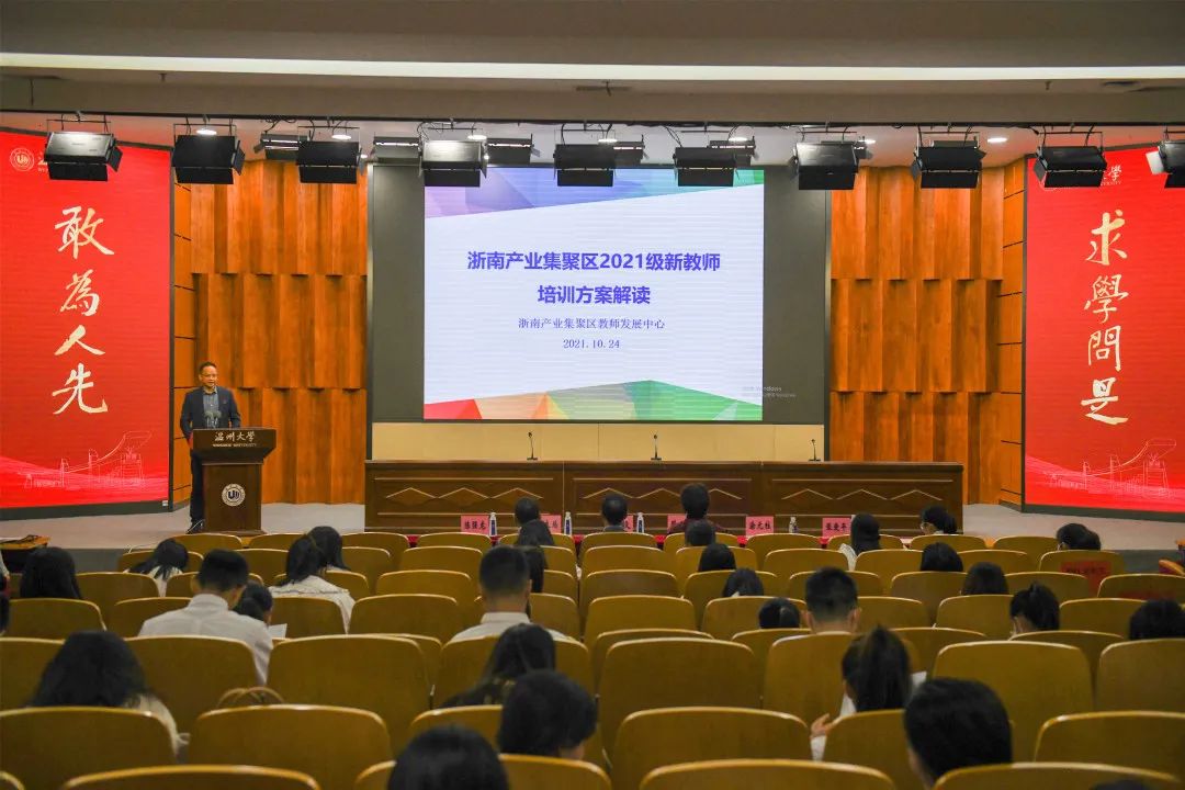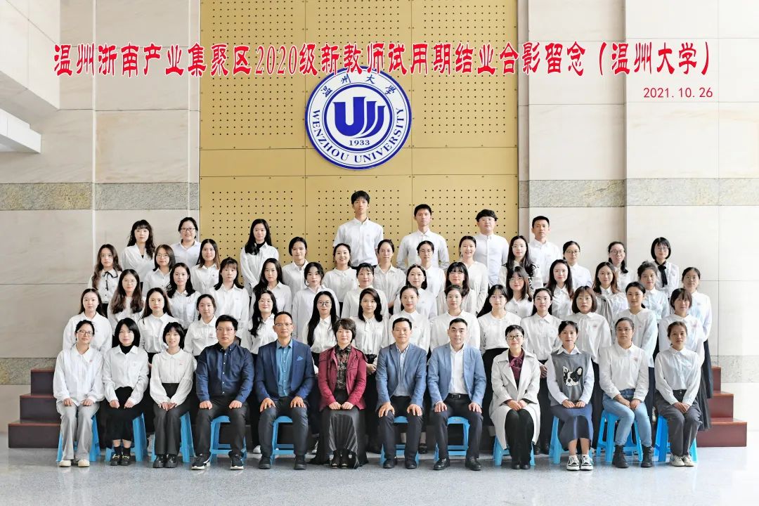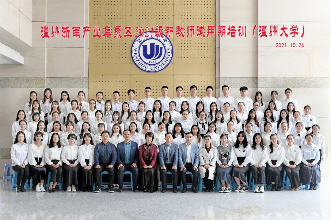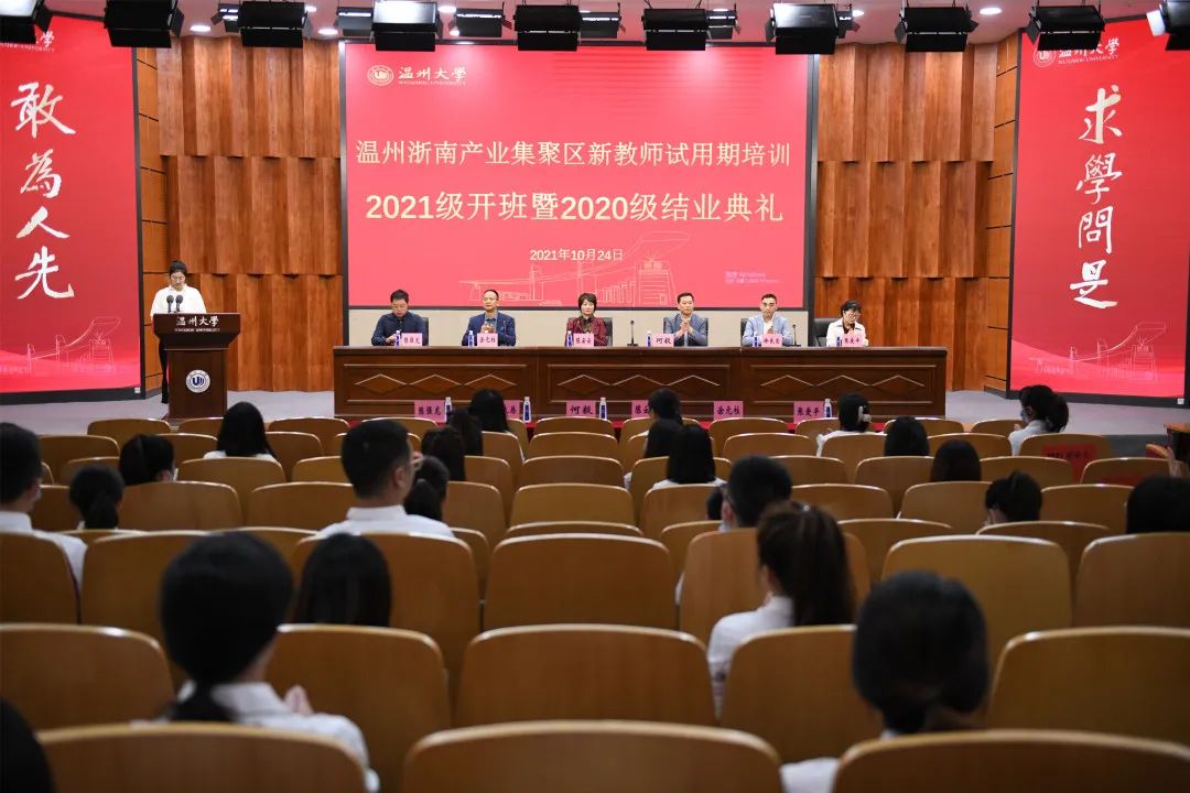2021年10月24日,90足球直播网 岩松堂雁山厅迎来了温州浙南产业集聚区新教师试用期培训2021级开班暨2020级结业典礼。90足球直播网 何毅书记,区文教体局党委书记、局长陈云云,综合人事处、研训处、温大培训中心领导嘉宾及集聚区中小学、幼儿园162名学员共同出席了典礼。