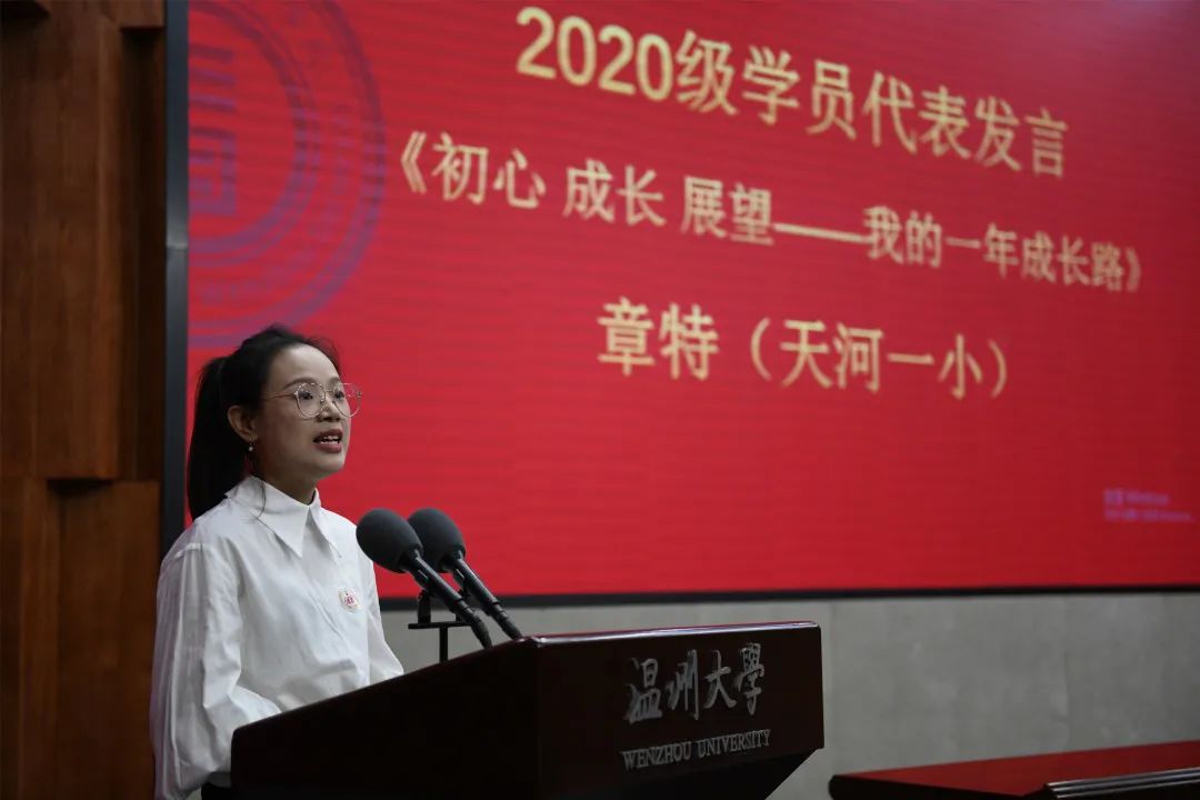 学员章特老师代表2020级学员,向90足球直播网 、温州浙南产业集聚区、区教师发展中心,致以诚挚谢意,她用“初心 成长 展望”概括了这一年的心路历程和她坚定地表示教育将是她一生的事业。