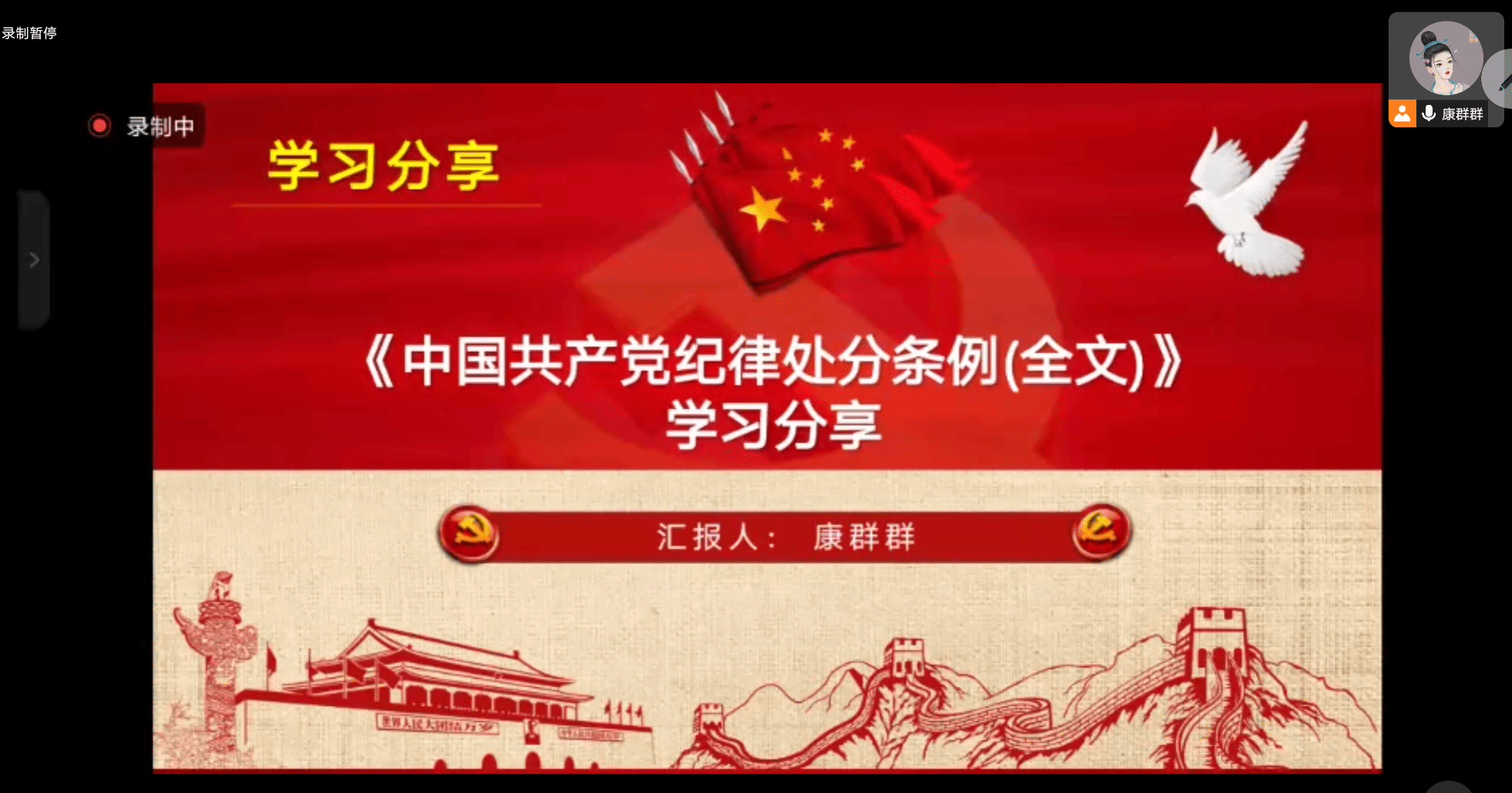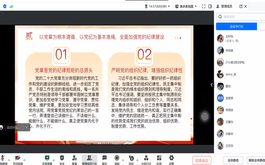 【90直播 第五学生党支部】2024年7月13日,90直播 第六学生党支部以腾讯会议形式开展“强城有我,争当先锋”主题党日活动,由高慧佳主持,11 名党员全员参与。活动中,党员们观看了《“循迹溯源学思想促践行”加强纪律建设是全面从严治党的治本之策》《汲取传统廉洁文化智慧 构建新时代廉洁价值观》两个视频,陈秀雯、韩乐琪同志分别进行学习分享与党的纪律建设历史沿革回顾。此次活动让党员们坚定了理想信念,明确了方向,大家表示将为实现中国梦贡献力量,诠释党员担当。