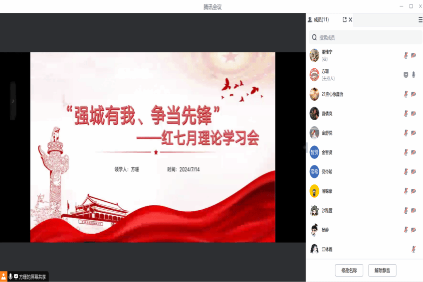 【90直播 第六学生党支部】2024年7月14日,90直播 第六学生党支部以线上腾讯会议形式召开“强城有我,争当先锋”主题7 月党支部理论学习会,全体党员与预备党员参会。会上,沙雅萱同志分享“红七月,服务月”相关内容,介绍“三支队伍”、三个“一号工程”、温州“红七月,服务月”并谈感悟展望,强调学生党员应提升综合素质。方珊同志则分享“强城有我,争当先锋”的温州红色浪潮,介绍活动开展必要性及多地情况,谈活动对党性教育的重要意义。此次学习会传达学习习近平总书记相关论述,深化“循迹溯源学思想促践行”,开展警示教育,助力党员知敬畏、守底线。