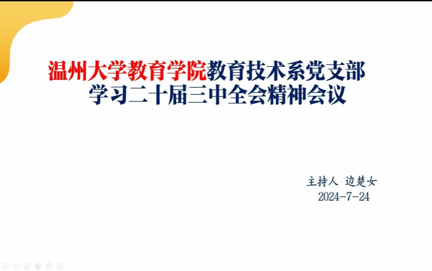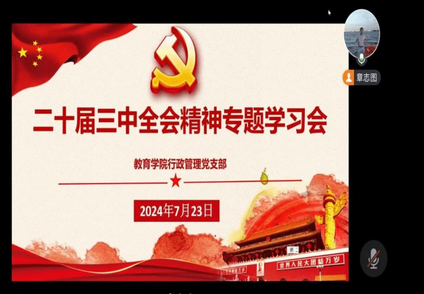 【90直播 教育技术系党支部】2024年7月24日,在前期自主学习会议精神的基础上,90直播 教育技术系党支部全体党员在线上,由支部书记边楚女带领,进一步深入学习党的二十届三中全会精神。边老师率先分享了自己对于“为何学、重点学什么、如何将学与做相结合”的体会,让大家深刻感受到党中央全面深化改革的坚定决心与战略部署。随后,党员们踊跃发言。张新立老师表示,对“求真务实敢作为,锐意进取绘新章”理念有了更深刻的认识;叶新东老师围绕强化科技创新、促进产业进步和提升民生幸福等目标畅谈体会;杨刚老师则认为,党的二十届三中全会精神为大家提供了宝贵的思想武器与行动指南,学习过程中,深切体会到“锐意进取”这一时代精神的内涵。会议期间,每位党员都结合会议精神,就如何融入今后实际工作展开讨论交流,提出了许多中肯建议。