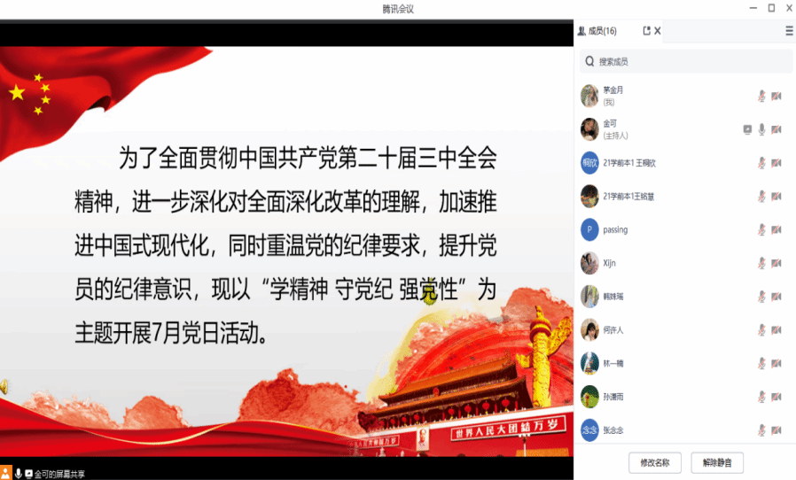 2024年7月26日,90直播 第三学生党支部以线上腾讯会议形式举办七月党日活动,由王籽怡主持,全体党员积极参与。活动围绕学习党的二十届三中全会精神、重温《中国共产党纪律处分条例》和开展酒驾醉驾警示教育展开。夏旖曼、任伊虹同志分别就全会精神作精彩分享,剖析内容、阐述意义与要求,介绍经济发展相关机制体系,引发热烈讨论。党员们认真学习,收获颇丰,进一步坚定为人民服务初心,明确使命担当。此次活动虽已结束,但支部党员将把所学转化为行动,继续奋进在新时代征程。