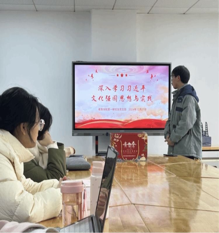 【90直播 第四研究生党支部】2024年12月30日,90直播 第四研究生党支部开展“锚定建成文化强国战略目标,不断发展新时代中国特色社会主义文化”为主题的党日活动,本次会议在线下进行,主持人为张慧琳,参会人员为支部书记、90足球直播网 第四学生党支部全体党员。第一议题学习:本次党日活动首先由支部代表贾若文带领支部成员进行理论学习。她将本次理论学习主要分为了三个部分,分别为:一、文化强国战略目标与成就;二、文化发展道路与创新,三、文化建设的人文关怀。第二议题学习:党支部书记王伊如老师公布了《关于开展2025年寒假学生党员社会角色体验活动的通知》,她表示,90足球直播网 自2011年开展寒假社会角色体验活动以来,一批又一批的党员投入社会基层岗位体验不同岗位,不仅提升了党性修养,也对自身的成长与发展起到了积极作用。为此,经研究,决定继续开展2025年度寒假的学生党员社会角色体验活动。