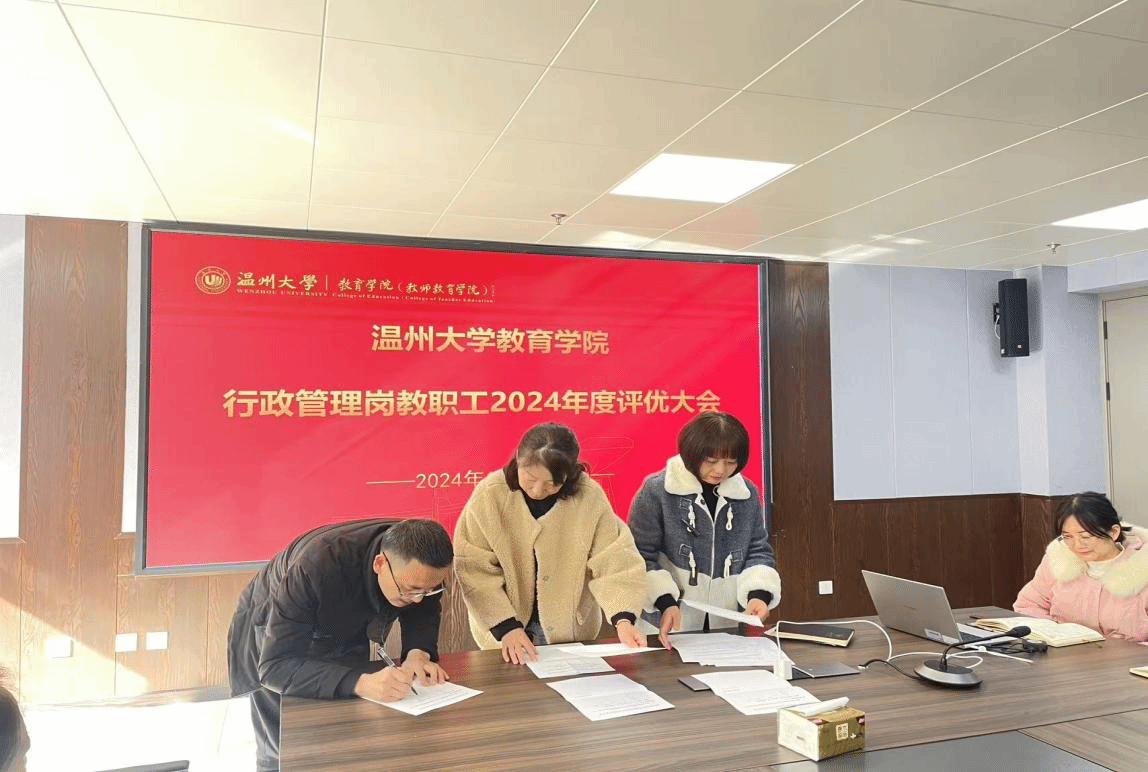 2024年12月9日,行政管理党支部按照学校《关于开展温州大学2024年度优秀共产党员、优秀党务工作者、优秀教师、优秀(教育)工作者评选工作的通知》文件精神,90直播 行政党支部和行政科室成员于12月9日在瓯8-208会议室召开2024年度评优大会,会议由学院党委副书记,行政支部书记章志图主持。会议内容主要有:一、行政党支部书记章志图向全体支部党员和科室成员传达学校、学院有关2024年度评优文件精神及名额分配;二、院办、教学科、学生科、研究生培养科等科室负责人推荐优秀人选,并就候选人情况进行说明和介绍;三、经过投票,大家推荐粱富乐、付诗善、王伊如、施星鸿等4位老师为校级优秀。四、学院党委书记张敏讲话,强调行政管理岗人员要树立节约意识、服务意识、大局意识。