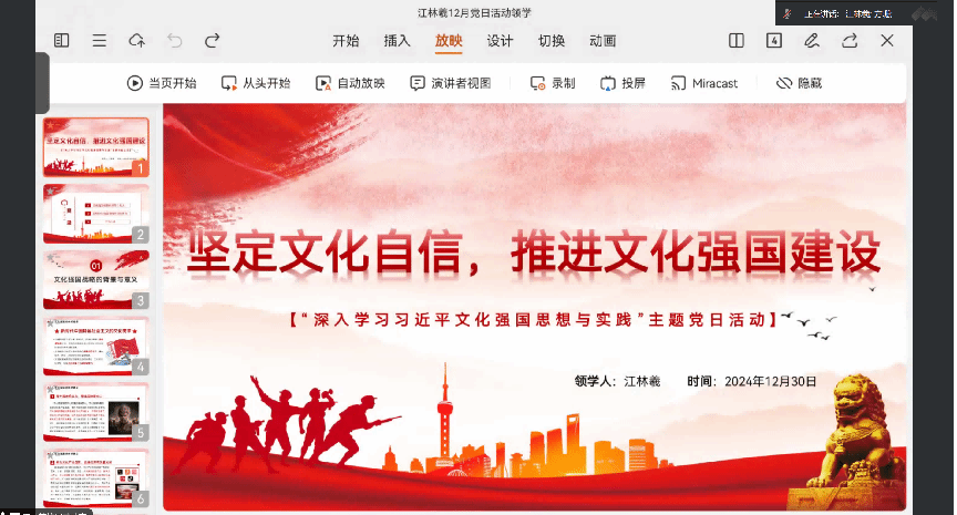 2024年12月30日,90足球直播网 第六学生党支部以“深入学习习近平文化思想与实践”为主题于腾讯会议召开了12月支部理论学习会。此次学习会由方珊主持,领学人江林羲、曹倩岚分别带领支部成员学习习近平文化思想。第一项议程是由江林羲同志带来“坚定文化自信,推进文化强国建设”的主题分享。第二项议程是曹倩岚同志分享的关于“习近平文化思想”的相关背景、内容等信息的介绍。经过此次关于对“习近平文化思想”的深入学习,大家在本次理论学习会中对于习近平文化思想有了更为深刻的感悟。