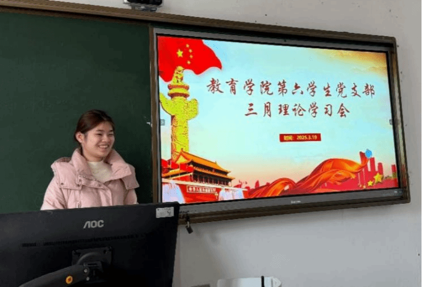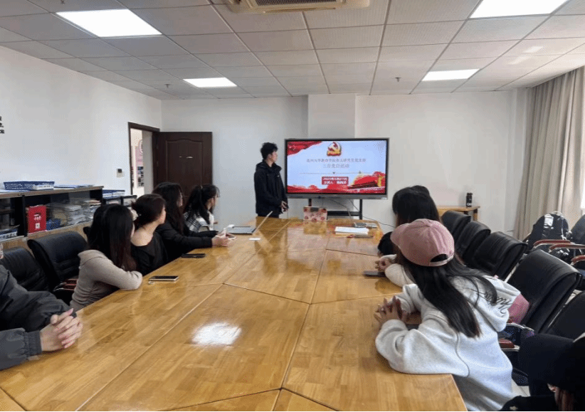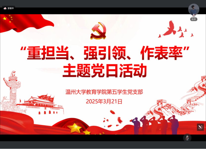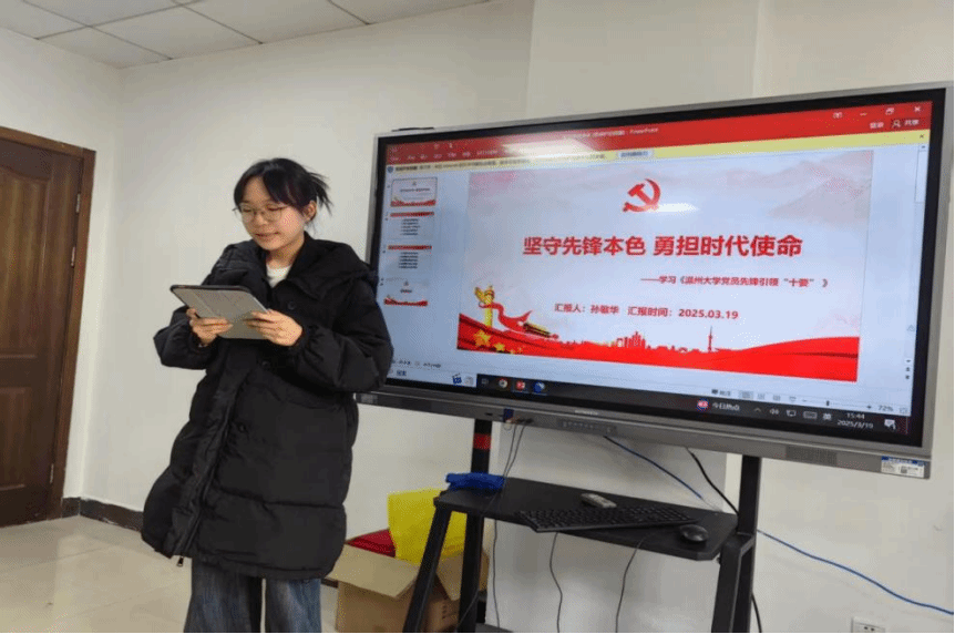 【90直播 第四学生党支部】2025年3月19日,90直播 第四学生党支部以“重担当、强引领、作表率”为主题开展3月党日活动,旨在深入推进“培根铸魂强基工程”,完善学校相关工作体系。活动聚焦学习习近平总书记关于党的建设及党员队伍建设的重要论述,落实高校党建工作会议精神,以《温州大学党员先锋引领“十要”》和“先锋指数”星级进阶评价为依托,增强师生党员党性与宗旨意识。活动开始,支部书记侯利兵强调学习重要论述与会议精神,并交流《温州大学党员先锋引领“十要”》践行路径。随后,主持人阮心甜带领学习党员参教信教认定标准,党员签订承诺书,还围绕《温州大学党员先锋引领“十要”》交流,赵乐鸯、薛悦、孙嘉鸿等党员分别分享在 “党员先锋岗”“党员责任区”的工作收获与自我鞭策、完善机制的体会。
