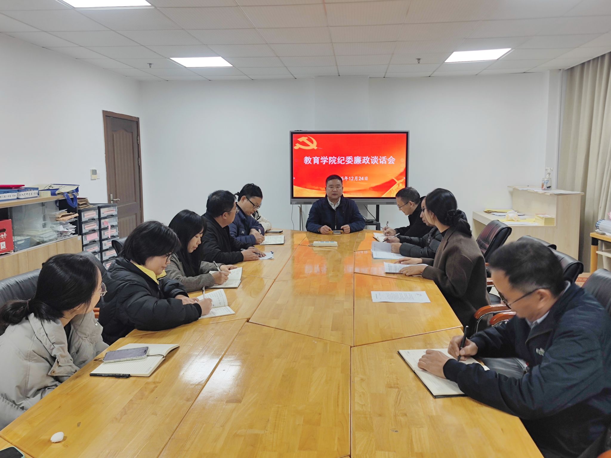 2025年12月24日下午,90足球直播网 在党员之家召开学院行政干部集体廉政谈话会。学院纪委书记章志图主谈,全体行政人员参会。会议围绕“知敬畏、存戒惧、守底线”主题,结合高校廉政风险防控重点,为学院事业高质量发展注入“廉动力”。