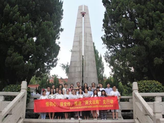 2018年6月29日下午,教师90直播 组织师生党员赶赴江心屿,开展“悟初心、强党性,推进‘两大战略’见行动”的主题党日活动。在江心屿革命烈士纪念碑前,教工党员潘士杰与学生党员张乐代表学院为革命烈士献上花圈,在场党员同志默哀并鞠躬,表达对革命先烈的缅怀之情。在鲜红的党旗下,聂海燕同志带领各位党员同志重温入党誓词。学生党员阮郑醒、周文带领大家一起学习了毛泽东同志的《为人民服务》与习近平同志的《用党员的标准严格要求自己》两篇文章。学院党委书记杨立淮在革命烈士纪念碑前发表了讲话,他结合这两篇文章的学习指出,学院党组织和党员要始终牢记全心全意为人民服务的宗旨,在推进事业发展中要发挥好基层党组织战斗堡垒作用和党员先锋模范作用。最后,党员同志们在解说员的带领下参观革命纪念馆。党员同志们纷纷表示,应该继承先烈遗志,发扬革命传统,坚定理想信念,不忘初心,为党的事业奋斗。