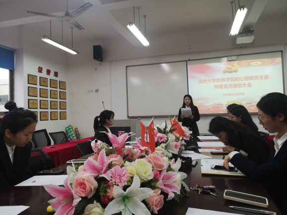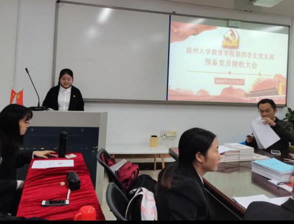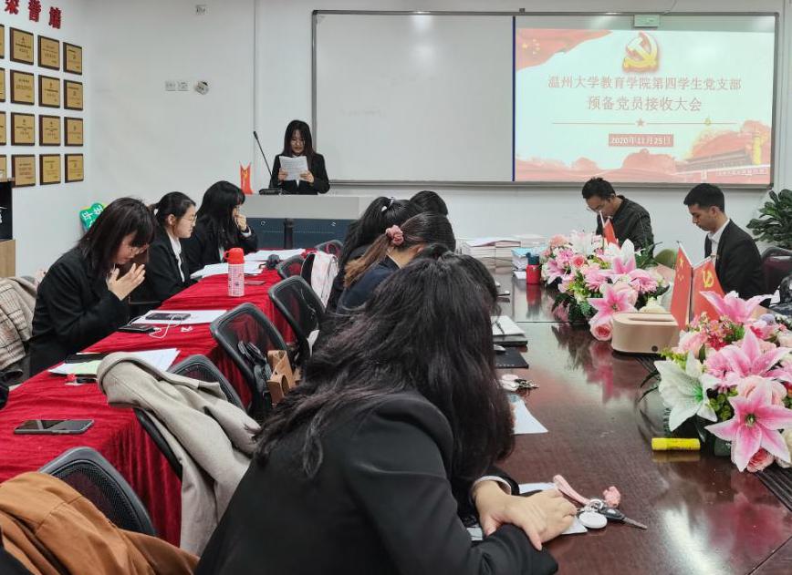 2020年11月25日,第四学生党支部中共预备党员接收大会在90直播 9A204举行,会议由谢红同志主持,该支部全体党员参与此次会议。经党支部大会决议,一致同意接收蒋雨彤、邵可儿、周宁、黄淑怡、王科逸、向洋6名同志成为中共预备党员。