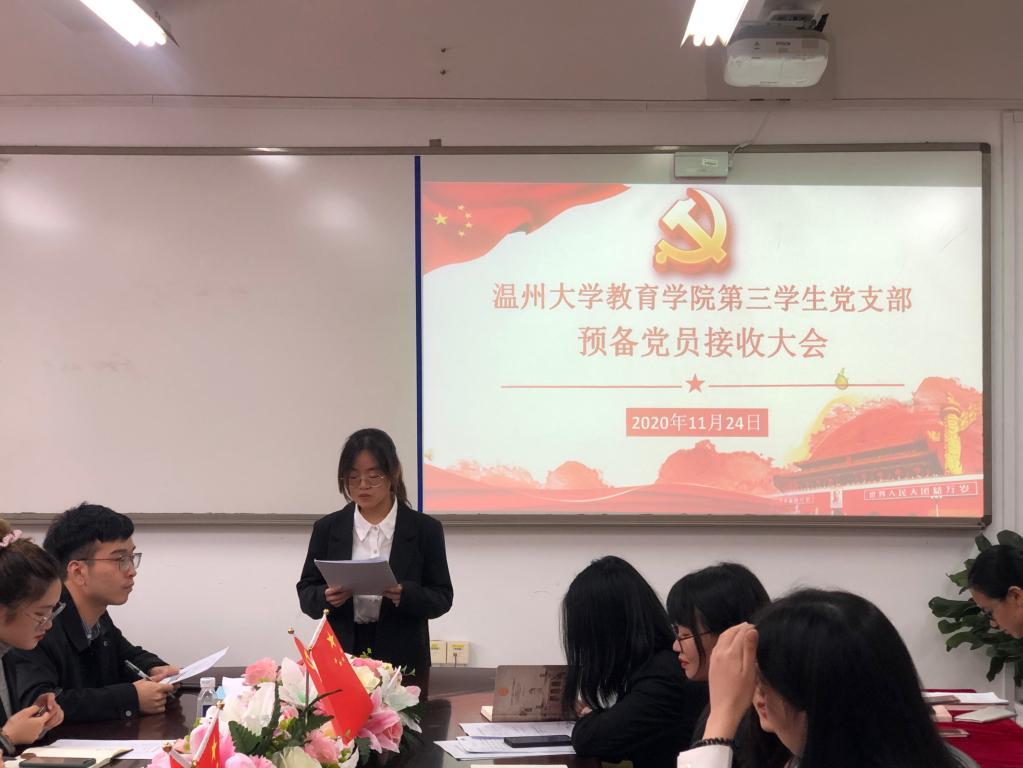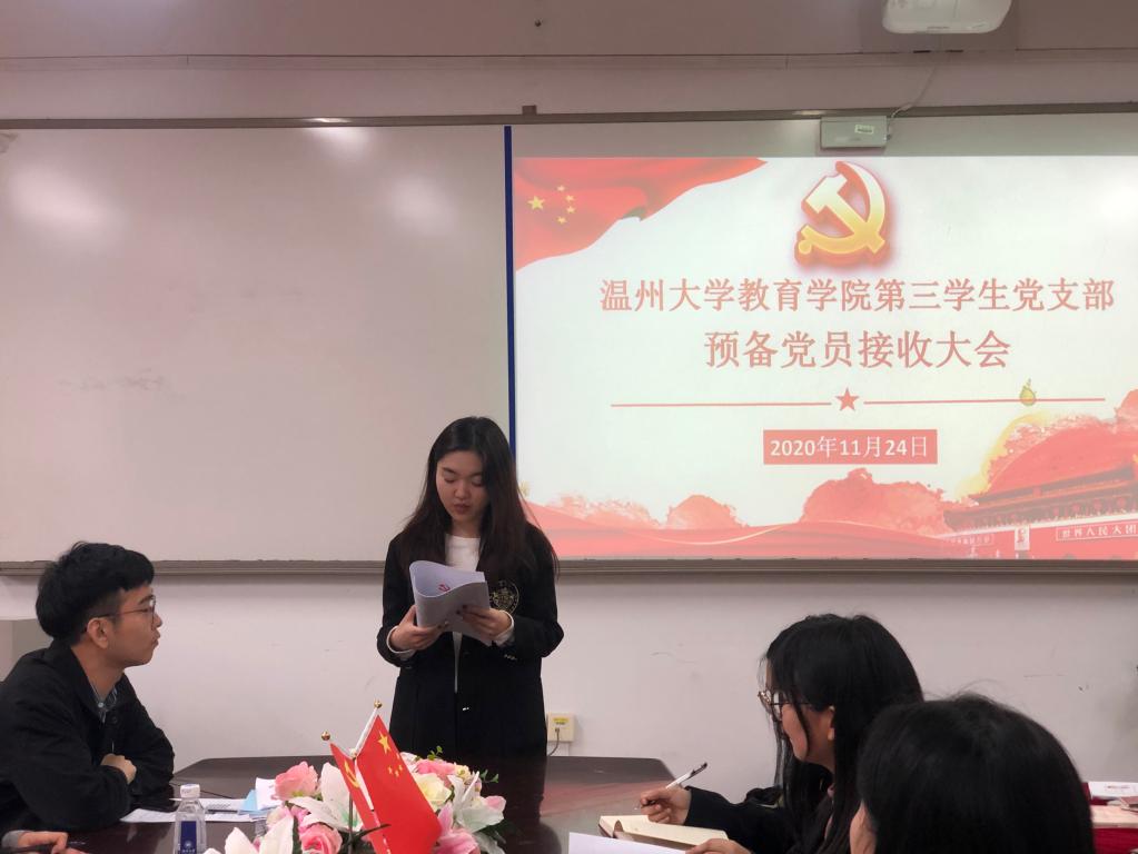 2020年11月24日,第三学生党支部中共预备党员接收大会在90直播 9A204举行,会议由党支部书记何奔奔同志主持,该支部全体党员参与此次会议。经党支部大会决议,一致同意接收陈佳妮、应镁甜、高天悦、陈乐翔4名同志成为中共预备党员。