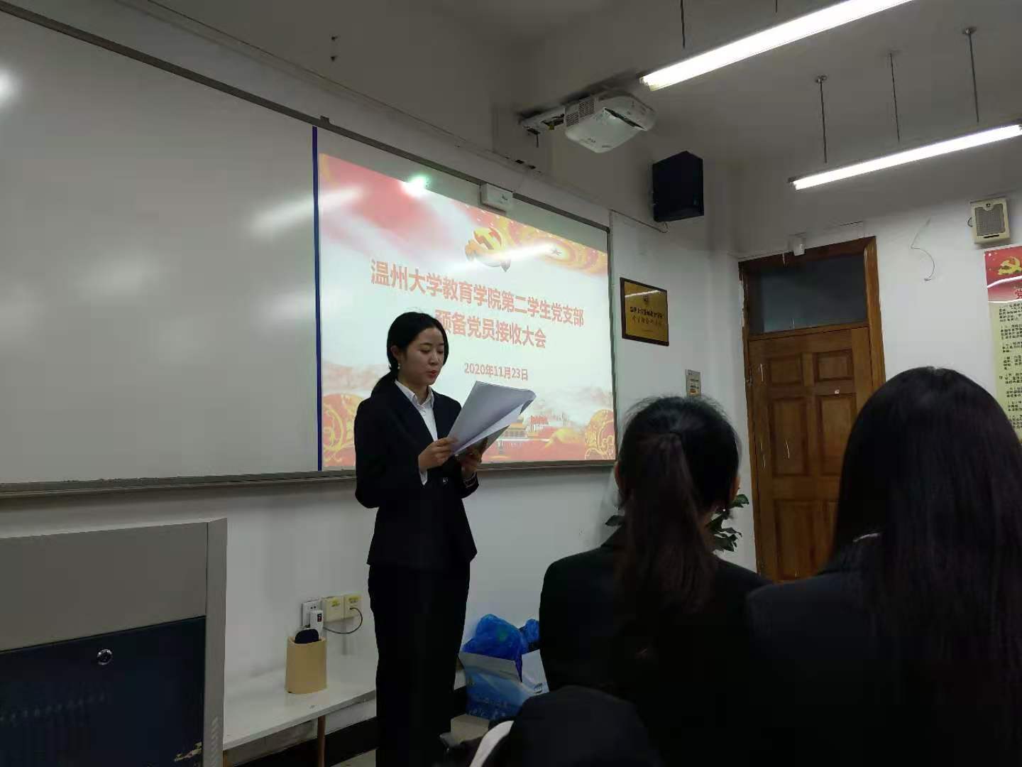 2020年11月23日,第二学生党支部中共预备党员接收大会在90直播 9A204举行,会议由谢佳希同志主持,该支部全体党员参与此次会议。经党支部大会决议,一致同意接收韩钱悦、谢灿莉、徐莹莹、余欣媛、贺静雯5名同志成为中共预备党员。