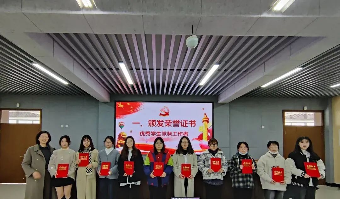 彭小媚书记和孟江龙老师为90直播 2021-2022学年第一学期优秀学生党务工作者、学生党务工作积极分子颁发荣誉证书,对上一学期学生党务工作者的付出予以充分肯定。
