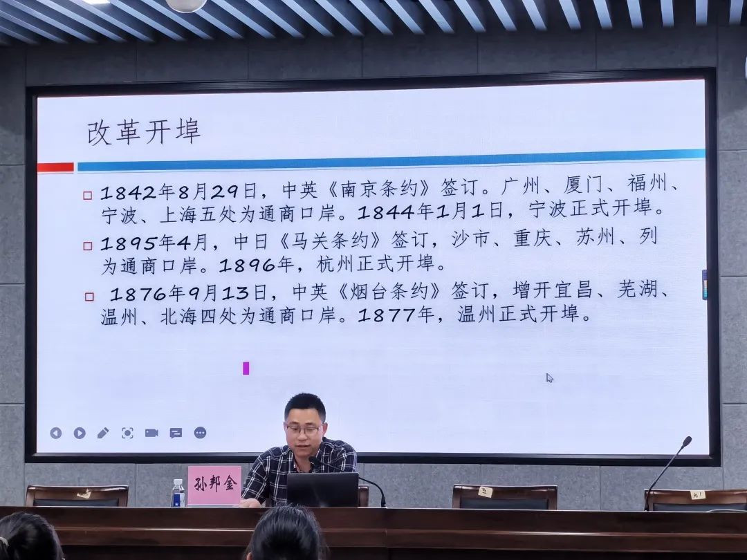 《形势与政策》课是高校学生思想政治教育的重要内容,是高校思想政治理论课的重要组成,是帮助大学生正确认识新时代国内外形势,深刻领会党和国家事业取得的历史性成就、发生的历史性变革、面临的历史性机遇和挑战的核心课程。2022年6月1日下午,90足球直播网 采用线上和线下相结合的形式开展《温州改革开放史与新时代温州人精神》讲座,马克思主义学院副院长孙邦金教授担任本次课程主讲人。学院党委副书记章园园、学工办主任严晓秋、辅导员孟江龙一同听讲了本场报告。