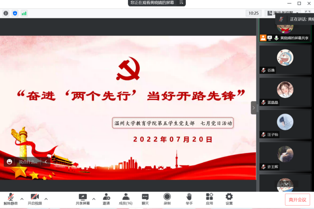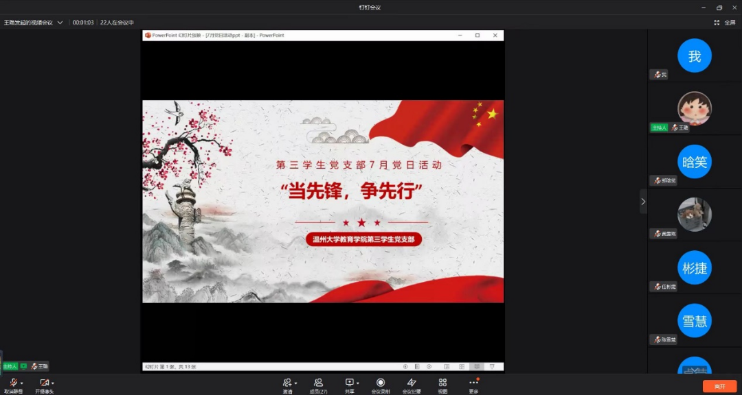 2022年7月13日,90直播 第三学生党支部在钉钉群中,以线上视频会议的方式举行了七月份的支部理论学习会。本次大会由王璐同志主持,第三学生党支部全体党员参加了此次会议。