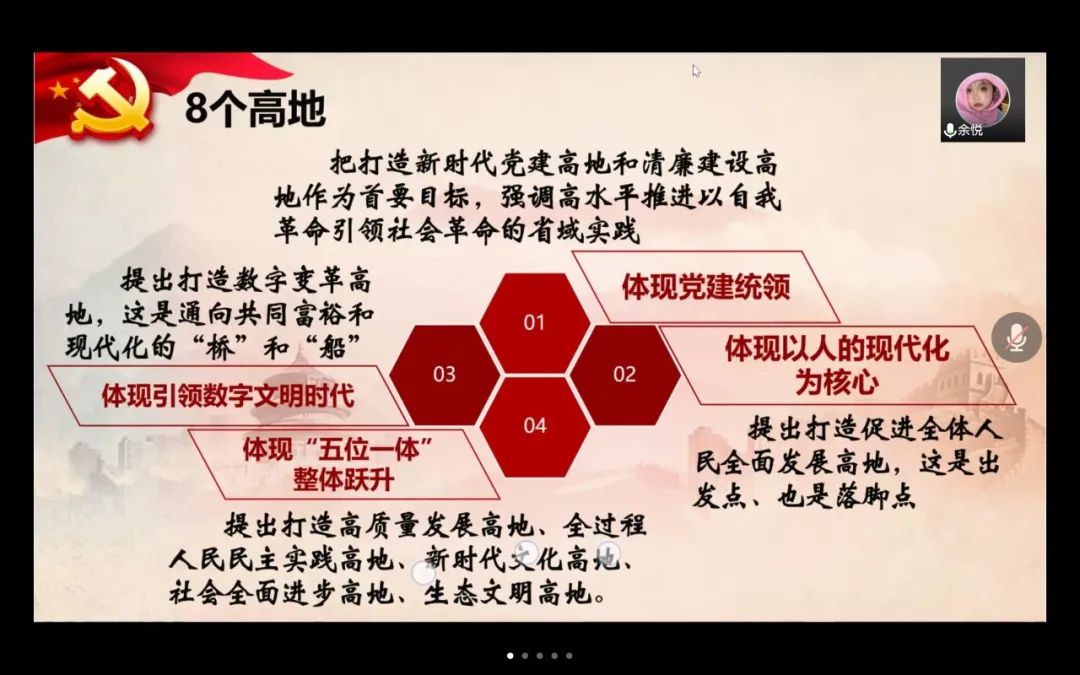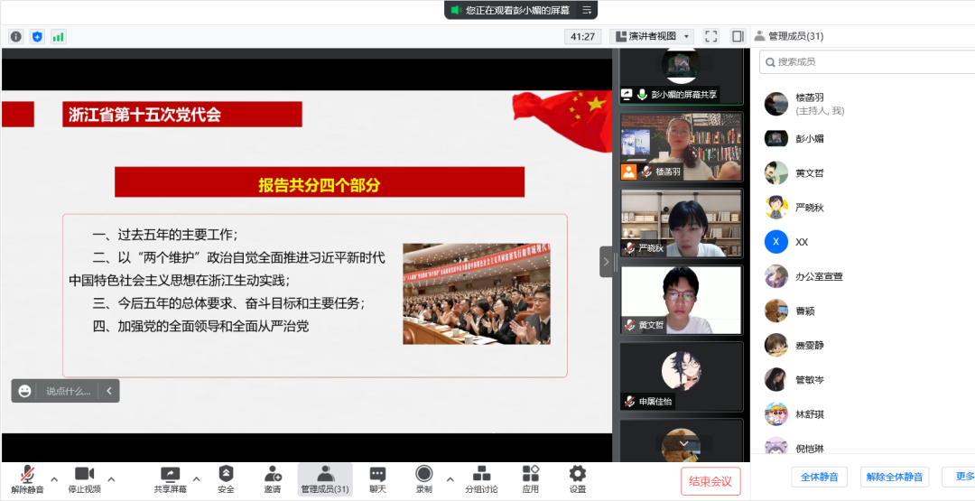 知心姐姐党支部结对行政党支部,会议伊始,由学院党委副书记、纪委书记、行政党支部书记彭小媚为同志们深入解读浙江省第十五次党代会报告。她将报告的四部分内容简要概述为成效、经验、奋斗目标和主要任务、机制保障,并一一展开相关内容的介绍与总结,思路清晰,言语精炼,在准确向同志们传达了报告精神的同时,鼓励同志们深入实践、勇于创新、敢于开拓。