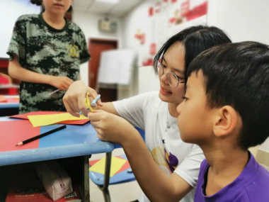 课堂中,老师运用语言的魅力绘声绘色地讲述了小英雄雨来的故事,孩子们听得入了迷,仿佛自己就是那位面对日军威胁但毫不畏惧的小英雄,眼中闪烁着崇拜与期望。绘本故事结束后,便进入到手工环节。孩子们积极地动起小手,画出金黄色的党徽图案,并将“党徽”附在了红色的立体圆盘上。在老师的帮助与同学们的互相协作下,一个个精美的手工作品从孩子们的手中诞生。最后,每个孩子都捧着自己的作品绽放出了满意的笑容。