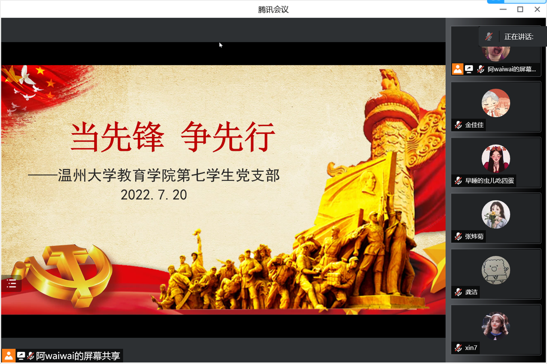 2022年7月20日,知心姐姐党支部于腾讯会议上开展“奋进‘两个先行’当好开路先锋”主题“红七月·服务月”暨“当先锋、争先行”主题党日活动学习的成果交流汇报。