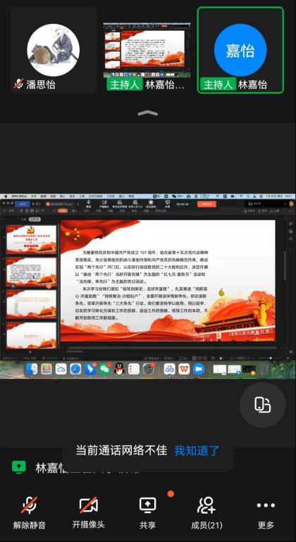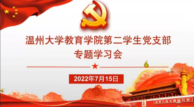 2022年7月15日,90直播 第二学生党支部于钉钉线上召开了“奋进‘两个先行’当好开路先锋”七月主题学习会。本次主题学习会围绕“奋进‘两个先行’当好开路先锋”主题,深入学习贯彻习近平新时代中国特色社会主义思想,贯彻落实省第十五次党代会精神,深入实践护航先行“三大争先”行动,全面发动广大党员围绕共富带富、疫情防控、基层治理等进行大实践、大比拼、大服务,立足岗位创先争优、干事创业,努力当好“两个先行”开路先锋,为温州续写创新史、走好共富路作出新的更大贡献。
