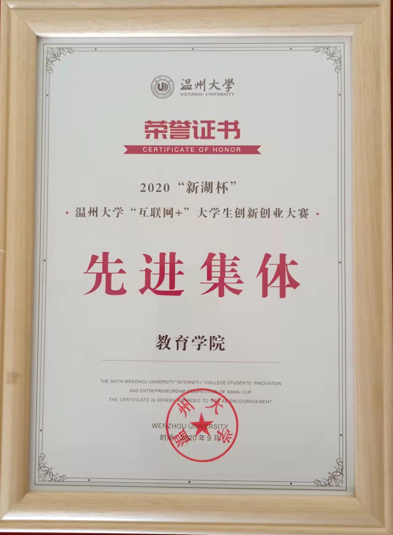 2020“新湖杯”温州大学“互联网+”大学生创新创业大赛先进集体(2020-9)