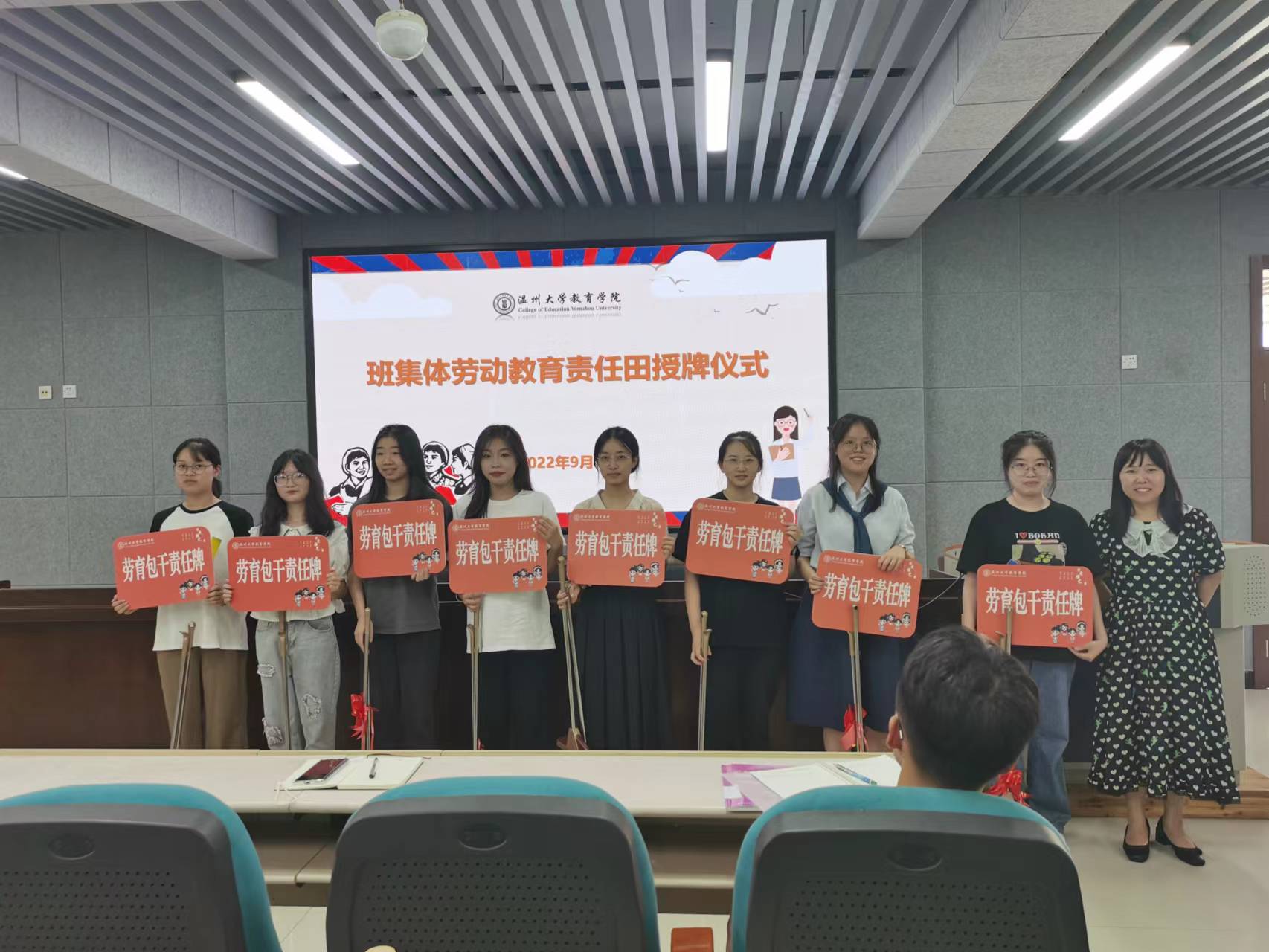 9月19日中午,为进一步贯彻落实中共中央国务院发布《关于全面加强新时代大中小学劳动教育的意见》,90足球直播网 22-23学年第一学期班级劳动教育责任田分包仪式于9C301举行。院党委副书记章园园、资助部指导老师薛彬鹏出席,22学前专科班和21、22本科班级的生活委员同班长一起参加了会议。