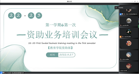 为了本学期资助工作的顺利进行,90直播 资助部于2022年8月27日召开了2022-2023学年第一次资助业务线上培训会议,参会人员为19-21级生活委员以及所有2022级新生班助。在本次会议中,90直播 学工办薛彬鹏老师主要围绕助学金申请,学费缓交申请,新生绿色通道慰问金申请,临时困难补助、临时变故补贴申请,勤工助学申请等方面展开讲解,详细介绍了本学期即将展开的资助业务。