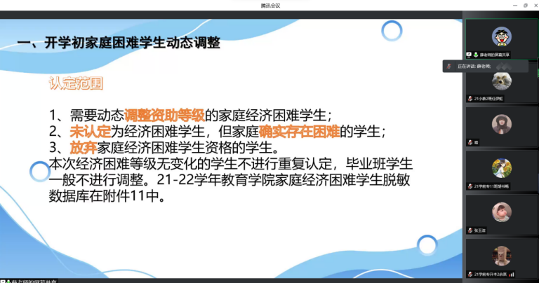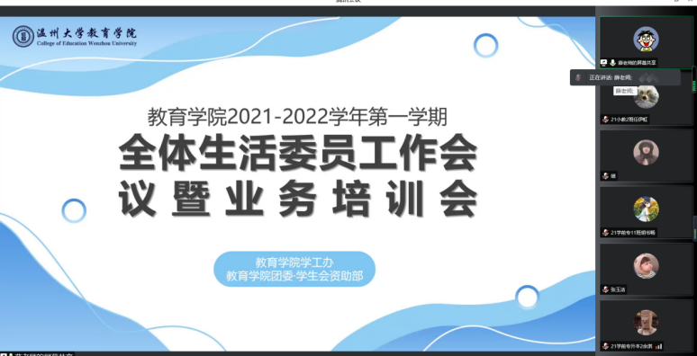 新学期,新气象。为了将资助落实到位,为了能够提供更优质的服务,在学工办薛老师的精心组织下,在落实疫情防控下,教院的生活委员们进行了一次成功的线上培训,争做突破冰冷云层的第一缕暖阳,为同学们带来温暖。