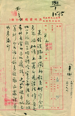 瑞安师范学校-1949年9月温州专署专员郑海啸副专员邱清华关于安插瑞安简师教员的复函和领取课本的通知