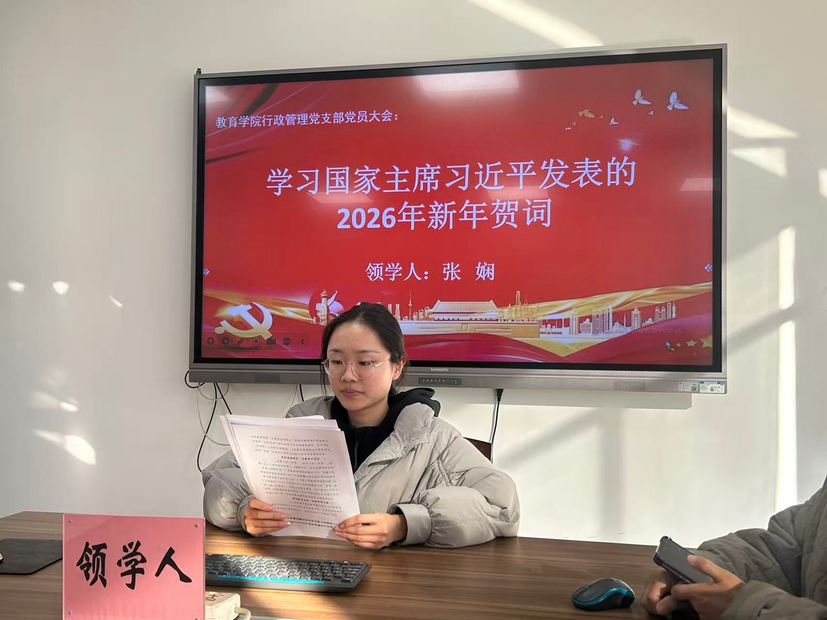 张娴同志带领大家学习了习近平主席2026年新年贺词。贺词中回顾了“十四五”期间的辉煌成就,激励党员们以更加饱满的热情和“跃马扬鞭”的干劲,积极投身到“十五五”新征程中,为实现中华民族伟大复兴的中国梦贡献力量。